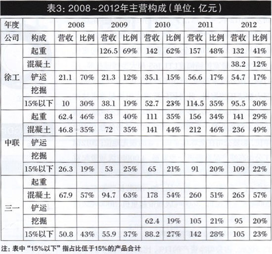 分析表3數(shù)據(jù),2012年?duì)I業(yè)收入超100億元的產(chǎn)品:徐工是起重機(jī),營收132億元、占到營業(yè)總收入4l%,其中占營業(yè)收入15%以上的產(chǎn)品還有鏟運(yùn)機(jī)械,占比17%、營收54.7億元;中聯(lián)有兩個(gè)營收超百億元產(chǎn)品,分別是營收236億元的混凝土機(jī)械和141億元的起重機(jī)械。占比分別是46%和34%,二者合計(jì)占比80%;三一近似有兩個(gè)超百億元產(chǎn)品,一個(gè)是營收265億元的混凝土機(jī)械和約百億元營收95億元的挖掘機(jī)械,分別占比57%和20%,二者合計(jì)占比77%?;赝?008年,三駕馬車沒有一個(gè)產(chǎn)品營收超百億元,其占比15%以上的產(chǎn)品:徐工是鏟運(yùn)機(jī)械,營收21.1億元、占比70%;中聯(lián)是起重機(jī)械、混凝土機(jī)械,占比分別是46%、35%,二者合計(jì)占比81%;三一是混凝土機(jī)械,占比57%。細(xì)分產(chǎn)品構(gòu)成,徐工的起重機(jī)主要以移動(dòng)式起重機(jī)為主,在行業(yè)處于龍頭地位;中聯(lián)的起重機(jī)包含移動(dòng)和塔式兩塊,其中塔式起重機(jī)是行業(yè)龍頭;在占比小于15%的部分,徐工有混凝土機(jī)械、壓實(shí)機(jī)械、路面機(jī)械等,中聯(lián)有土方機(jī)械、路面及樁工機(jī)械、環(huán)衛(wèi)機(jī)械等,三一有起重機(jī)械、路面及樁工機(jī)械等。