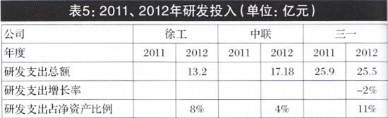 分析2011、2012年報(bào)表明,三一2012年研發(fā)投入25.5億元,占公司凈資產(chǎn)的11%,比2011年減少2%,研發(fā)投入出現(xiàn)下降趨勢(shì);2012年,徐工研發(fā)投入13.2億元,占凈資產(chǎn)的8%;中聯(lián)研發(fā)投入17.18億,占凈資產(chǎn)的4%;徐工、中聯(lián)研發(fā)投入和占比,均低于三一(見表5)。由此可知,在打造公司核心競爭力,提升公司價(jià)值方面,三駕馬車研發(fā)投入的趨勢(shì)和占比均存在提升的空間。