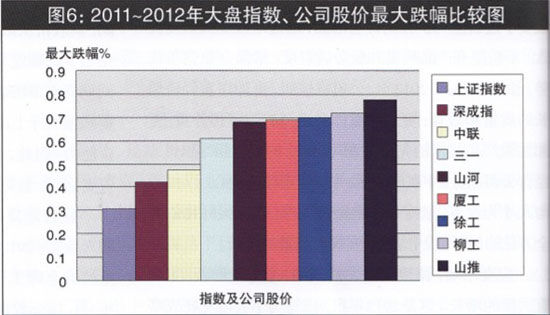 2011年,行業(yè)遭遇寒冬,三駕馬車營業(yè)收入合計(jì)增三率與宏觀經(jīng)濟(jì)指標(biāo)對(duì)比,呈加速度下跌態(tài)勢(shì),而且在資本市場(chǎng)的表現(xiàn)弱于滬深大盤指數(shù)。2011年~2012年間,其股價(jià)從最高點(diǎn)至最低點(diǎn),下跌47.3%、61.2%、69.8%不等;而同期上證指數(shù)下跌幅度只有30.67%,深成指下跌42.1%。盡管與行業(yè)內(nèi)其他上市公司同期資本市場(chǎng)表現(xiàn)相比,工程機(jī)械行業(yè)三駕馬車的表現(xiàn)仍有亮點(diǎn),但其同期跌幅大于上證和深成指跌幅,仍然令公司形象受損,影響資本市場(chǎng)再融資能力。因此,打造公司核心競爭力,提升公司投資價(jià)值,提振資本市場(chǎng)投資者信心,至關(guān)重要(大盤指數(shù)、公司股價(jià)最大跌幅比較圖,見圖6)。
