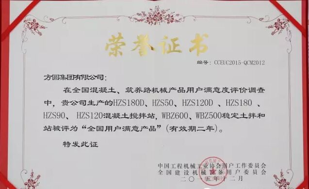 方圓集團(tuán)憑借在售后服務(wù)領(lǐng)域的突出表現(xiàn),榮獲“用戶滿意服務(wù)單位”的稱(chēng)號(hào),同時(shí),方圓集團(tuán)生產(chǎn)的HZS180D、HZS50、HZS120D、HZS180、HZS90、HZS120型混凝土攪拌站,WBZ600、WBZ500型穩(wěn)定土拌和站被評(píng)為“全國(guó)用戶滿意產(chǎn)品”。