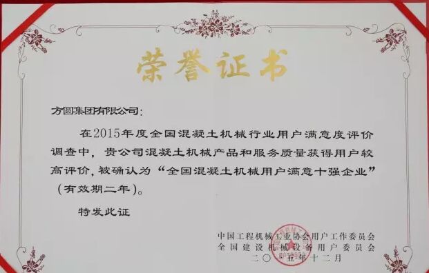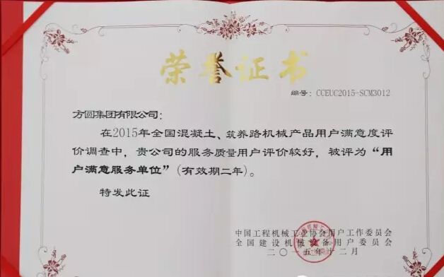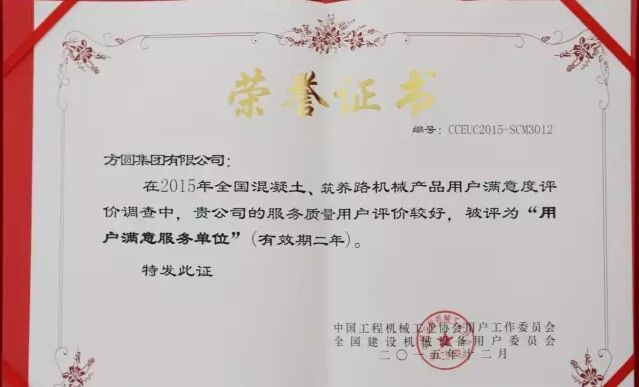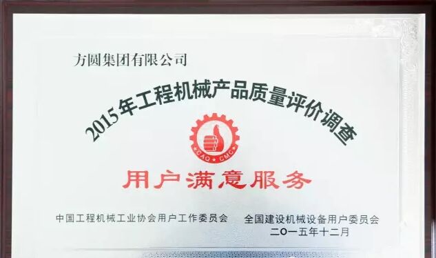此外,因?yàn)榉綀A集團(tuán)在2015年度全國(guó)混凝土機(jī)械行業(yè)用戶滿意度評(píng)價(jià)調(diào)查中,受到廣大用戶的一致好評(píng),被授予“全國(guó)混凝土機(jī)械用戶滿意十強(qiáng)企業(yè)”稱(chēng)號(hào)。在產(chǎn)品質(zhì)量調(diào)查中,連續(xù)七次被評(píng)為“全國(guó)用戶滿意單位”。